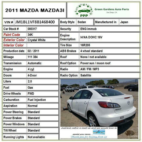 2010 - 2013 MAZDA 3 Rear Back Power Door Window Motor Left Driver Side LH G