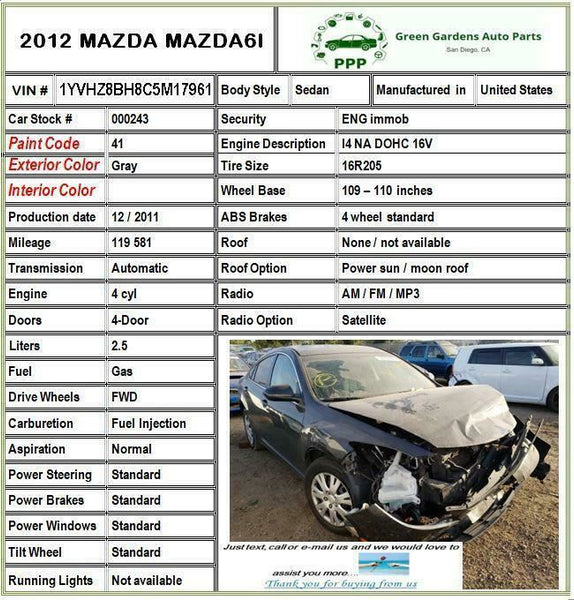 2012 MAZDA 6 2009 - 2013 Used Rear Wheel Bearing Hub ABS Right Passenger Side